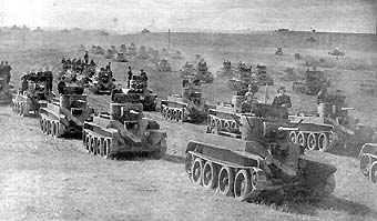 ![]() The BT-5 tanks of the 45th Mechanized Corps during manoeuvres. Kiev Military District, 1935. |