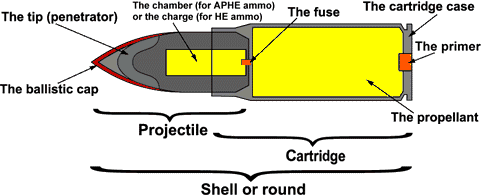 The High Explosive or HE projectiles are usually most effective in the large caliber of weapons. This is an ordinary shell which contains a warhead composed of a high explosive compound. Because the energy of the shell remains consistent, it can be fired at a lower velocity which allows for a larger warhead in most calibers. The shell consists of a thin-walled steel case, explosive charge and a fuse.�The main destructive power of a HE shell comes from the shock wave of the explosive charge. The fuse is generally set in the nose or the base, and detonates automatically on impact.�Although there are shells designed to detonate after a certain distance or in the air above the target, these are primarily the province of antiaircraft and artillery guns.