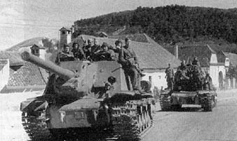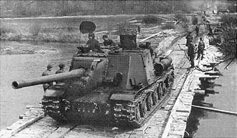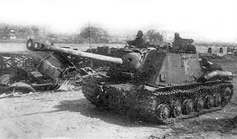 The first large-scale usage of the new assault guns was in summer 1944, during the Soviet offensive operation "Bagration", where at least 14 OTSAPs were involved. Soon, these guns acquired the honor of very effective weapon against German "Tigers" and "Panthers". For example, in summer 1944, the half of the 502th PzAbt (6 vehicles of 12 total) was destroyed by ISU's gunfire. Often those Heavy Self-Propelled Artillery Regiments used together with tanks or infantry and supported their attacks. Usually those ISU's become the main defensive weapon during sudden German counter-attacks. |