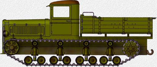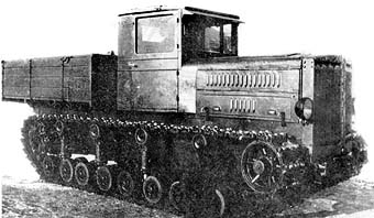To solve such problems like transporting heavy artillery (guns and howitzers up to 11 tones), crew and ammunition, development of a new heavy tractor has begin. By 1934, tractor was built and passed all trials successfully. It was accepted for service as "artillery tractor Komintern" (means "Communistic International"). It was based on "maneuverable tank T-24" (according to old Soviet classification).