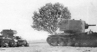 ![]() The KV-2 Tank from the 2nd Tank Division delayed the 6th Panzer Division near the Rossienie town. Tank was immobilized by the German's 105 mm Howitzer but continued fighting. It was abandoned when run out of ammo. |