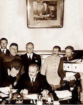 TREATY OF NONAGGRESSION BETWEEN GERMANY AND THE UNION OF SOVIET SOCIALIST REPUBLICSMOSCOW, August 23, 1939. The Government of the German Reich and the Government of the Union of Soviet Socialist Republics desirous of strengthening the cause of peace between Germany and the U.S.S.R and proceeding from the fundamental provisions of the Neutrality Agreement concluded in April 1926 between Germany and the U.S.S.R., have reached the following agreement: ARTICLE IBoth High Contracting Parties obligate, themselves to desist from any act of violence, any aggressive action, and any attack on each other, either individually or jointly with other powers. ARTICLE IIShould one of the High Contracting Parties become the object of belligerent action by a third power, the other High Contracting Party shall in no manner lend its support to this third power. ARTICLE IIIThe Governments of the two High Contracting Parties shall in the future maintain continual contact with one another for the purpose of consultation in order to exchange information on problems affecting their common interests. ARTICLE IVNeither of the two High Contracting Parties shall participate in any grouping of powers whatsoever that is directly or indirectly aimed at the other party. ARTICLE VShould disputes or conflicts arise between the High Contracting Parties over problems of one kind or another, both parties shall settle these disputes or conflicts exclusively through friendly exchange of opinion or, if necessary, through the establishment of arbitration commissions. ARTICLE VIThe present treaty is concluded for a period of ten years, with the provision that, in so far as one of the High Contracting Parties does not denounce it one year prior to the expiration of this period, the validity of this treaty shall automatically be extended for another five years. ARTICLE VIThe present treaty shall be ratified within the shortest possible time. The ratifications shall be exchanged in Berlin. The agreement shall enter into force as soon as it is signed. Done in duplicate, in the German and Russian languages. For the Government of the German Reich: With full power of the Government of the USSR: |
