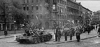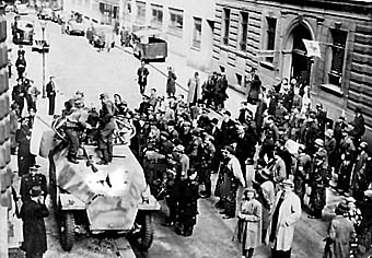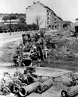 When it was clear, that general Patton's 3rd U.S. Army was definitive stopped in Pilsen, 40km southwest from Prague, that Prague should be captured by soviet troops and that political leadership of uprisers (Czech National Council, Ceska narodni rada), controled by communists, is not pleased by 1st Division presence in Prague, the Division left the city back to the Beroun at the evening of 7 May. From Beroun the 1st Division retreated via Horovice, Pribram to Lnare. On the road it's soldiers were warmly welcomed by Czech inhabitants as savers of Prague. - A field howitzer of 1st regiment in Prague-Pankrac, near todays Hrdinu Square, 7 May 1945. |