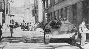 In the northest column, advancing on Beroun-Prague road, where divisional 3rd and 4th regiment marched, were at minimum two Hetzers. They were painted in three-colour stripe scheme. - A T-34/76 of the 1st division of ROA enters Counts of Kinsky Square in Prague Smichov, at 6 May 1945. |