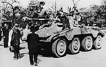 - Soldiers of 1st regiment manned in Prague-Vinohrady and Prague-Strasnice an unidentified armoured car. It was probably this SdKfz 234, which stood abandoned on Charles Square after the end of war. |