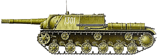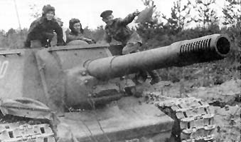 The first regiment of new assault guns was formed in May 1943. Soviet tankeers accept the new SPG with delight due to its ability to successful counteraction with German "zoo" (like "Tigers" and "Panthers"). During Kursk battle SU-152 received a new nick - "Zveroboy" ("Animal Killer") because during 12 days of battles this regiment could destroy 12 "Tigers" and 7 "Ferdinands". This regiment consisted of 12 SPGs, and later - of 21 SU-152 (winter 1943-1944). |