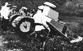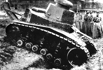 В марте 1927 года первый прототип танка покинул опытный цех "Большевика" и отправился на заводские испытания. Эта машина получил индекс Т-16. Она выгодно отличался от "Рено Русского" малыми размерами, весом и стоимостью при сравнительно большой скорости движения. Тем не менее, машина все еще обладала рядом серьезных недостатков, поэтому было рекомендовано усовершенствовать ряд агрегатов и узлов танка. Ходовая часть была удлинена на один каток, изменениям подверглись некоторые узлы двигательной установки, трансмиссии и т.д. Из-за неудовлетворительной работы энергетической установки Т-16 на завод прибыл А.Микулин - один из разработчиков двигателя танка. К середине мая построили новый танк, и после пробега в пригородах Ленинграда был отправлен в Москву (предположительно 20-25 мая) на полевые сдаточные испытания под обозначением "Малый танк сопровождения обр. 1927 г. МС-1 (Т-18)". Интересно отметить, что при перевозке танка из Ленинграда в Москву были опробованы все возможные способы его транспорти-ровки: ж.д. вагон, ж.д. платформа, кузов грузовика, автоприцеп и движение своим ходом. Поскольку пушка для МС-1 не была подана, в танк установили ее макет. Танк хотели покрасить, но из ОАТ последовало категорическое распоряжение: "красить танк только после принятия на вооружение..." Возможно после случая с Т-16, окрашенным непосредственно перед испытаниями в светло-зеленый цвет и не принятым, руководство ОАТ испытывало некое суеверие, приведшее к тому, что на испытания танк отправился лишь покрытый светло-коричневым грунтом, что впоследствии стало нормой. Для испытаний танка была образована специальная комиссия. Испытания проводились 11-17 июня 1927 года в Подмосковье пробегом по пересеченной местности, так как пушки для танка все еще не было. Танк в целом успешно выдержал испытания и был рекомендован для принятия на вооружение. Вскоре, 1 февраля 1928 года последовал заказ на изготовление в течение 1928-29 гг. для РККА 108 танков Т-18 (30 штук до осени 1928 года). Первые 30 танков были изготовлены на средства ОСОАВИАХИМа и приняли участие в параде 7 ноября 1929 года в Москве и Ленинграде под неофициальным названием "Наш ответ Чемберлену". Первоначально серийным производством занимался только завод "Большевик", но с апреля 1929 года к выпуску Т-18 был подключен также Мотовилихинский Машиностроительный завод (Бывший Пермский Артиллерийский) и план выпуска танков был увеличен. Однако в 1929 году массовое производство Т-18 там развернуть не удалось и за 1929 год из заказанных 133 танков было с трудом сдано 96. Тем не менее, Мотовилихинский завод осваивал танк и в 1929-30 гг. план выпуска Т-18 был увеличен до 300 единиц. Осенью 1929 года Т-18 принял участие в очередных испытаниях. Главным препятствием для него стал трапециевидный ров шириной более 2 и глубиной более 1,2 метра, из которого танк не мог выбраться самостоятельно (даже задним ходом). Для лучшей проходимости рвов по предложению М.Василькова и по распоряжению начальника Бронесил Ленинградского округа С.Коханский танк был оборудован вторым "хвостом" в передней части и тут же получил прозвище "носорог", или "тяни - толкай". Его проходимость действительно немного улучшилась, но обзор с места механика-водителя стал просто отвратительным. |