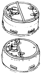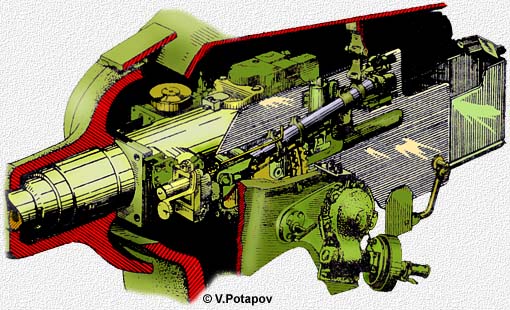 It consisted of a shaped steel casting. The front had an embrasure for mounting the gun, the coaxial machine-gun, and sight. Externally, four eye-bolts and three handrails were welded to the turret's walls, and six brackets for attaching tarpaulins were welded to the turret's rear wall. One firing port, closed off with an armored cover and latch, was located in each wall of the turret. Early production tanks with the D-5T gun had observation slits above the firing ports; in vehicles produced in 1944-1945, only the observation slit on the right side of the turret, at the loaders position, was kept. T-34-85s produced after the war had no observation slits in the turret. The cast cylindrical commander's cupola was located on the left side of the turret roof. Five observation slits, covered with protective glass, were cut into the cupola's sides for all around vision. The cupola, which could rotate on ball bearings, had a two-leafed folding hatch with an aperture for the observation scope in one of the halves. In tanks produced in 1945-1946, the cupola had a one-leaf hatch and the observation scope was placed in the fixed part of the cupola roof. The loader's round hatchway, with its hatch, was located to the right of the cupola. In addition, the turret had two apertures for mounting the gunner's and loader's MK-4 observation scopes, as well as two ventilation hatches covered with armored caps welded to the turret roof. The crew compartment's ventilators were installed beneath these. The turret was rotated by an electric traverse motor, or by hand. Using the electric motor, maximum turret traverse was 4.2 rpm. |