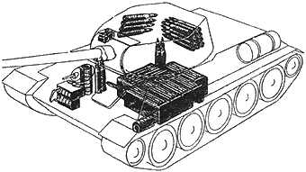 The gun's basic load consisted of 55 gun shells (36 high-explosive, 14 armored piercing, and 5 sub-caliber), and was placed in the hull and turret using three different types of stowage: racks, clamps, and crates (see drawing).