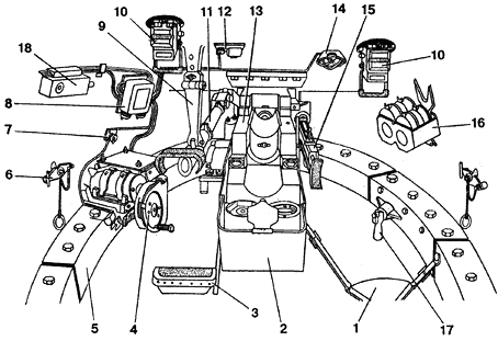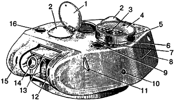 | 1. The loader's station; 2. The cartridge bag; 3. The gunner's station; 4. The turret traversing mechanism; 5. The turret ring; 6. The pistol port's stopper; 7. The backlight button for the gun's deflection; 8. The electrical control unit; 9. The telescopic sight holder; 10. The MK-4 observation sight; 11. The The TNSh-16 telescopic sight; 12. The backlighting for the TNSh-16; 13. The gun; 14. The illumination lamp; 15. The coaxial machine-gun; 16. Machine-gun magazines; 17. The turret locking mechanism; 18. The TPU communication device. |