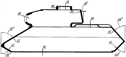 The hull of the tank, as compared with the T-34, did not undergo any fundamental changes. They may all be reduced down to construction simplification. The girder in the bow was removed and the upper and lower frontal plates were joined with a weld. Grommets (hooks) for attaching spare tracks were welded to the upper plate. The aperture for the antenna lead on the upper right plate was removed. Brackets for attaching BDSh smoke pots were fixed to the upper rear plate. Despite claims that periodically occur in print, the armor on production T-34-85's front hull remained unchanged at 45 mm (I have encountered quotes of 60 mm, 75 mm, and even 90 mm). In reality, the armor was increased only on the new turret, to 90 mm.