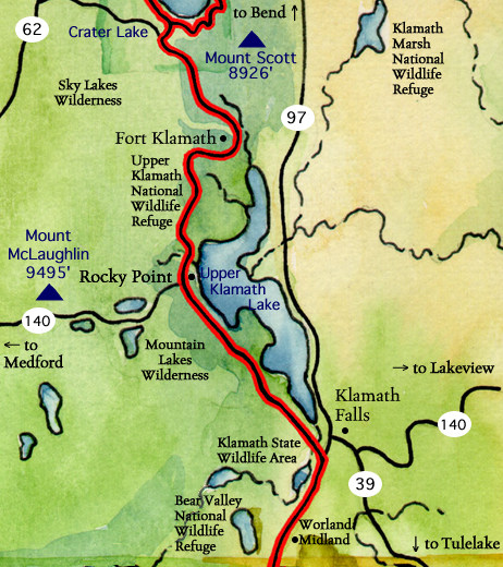 The Volcanic Legacy Scenic Byway follows Oregon Route 62 through peaceful pastures to Fort Klamath. Now a cattle-raising district, this area was the scene of frequent clashes between white settlers and the Modoc indians during the 1870's. The historic site of the military installation now has a reconstruction of one of the original buildings and several historical displays. The byway tour continues on Weed Road to Sevenmile Road west, then south on West Side Road along the edge of the Upper Klamath National Wildlife Refuge and Upper Klamath Lake.