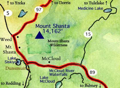 | The Mount Shasta Region Route Description The Byway circles Mount Shasta, providing views from every angel of our nations second hghest volcano. From the town of Weed on the north, the route leaves Highway 97 and enters Interstate 5, the main north-south freeway of northern California. The view of the mountain here is up Diller Canyon to the summit of Shastina, Mount Shasta's northernmost peak. Passing Black Butte, a small plug volcano, Interstate 5 comes to the City of Mt. Shasta. This full service community offers everything the travler might need, and is the center of mountaineering and exploration for Mount Shasta. Side roads lead high up the mountains slopes to Bunny Flat and the Old Ski Bowl area well above treeline, or west to the mountain lakes and rivers of the Eddys. Just south of Mt. Shasta City, the Byway leaves Interstate 5 and heads east on Highway 89, en route to McCloud. (A recommended side trip of 6 miles further south on Interstate 5 will treat ythe traveler to the historic railroad toen of Dunsmuir, nstled in the Upper Sacramento River cnyon.) Driving over the south flank of Mount Shasta, the grasslands and high desert environs of the north are exchanged for conifer forests stretching as far as the eye can see. Mount Shasta Board and Ski Park is just off Highway 89 between Mt. Shasta and McCloud, and offers year-round recreation. |