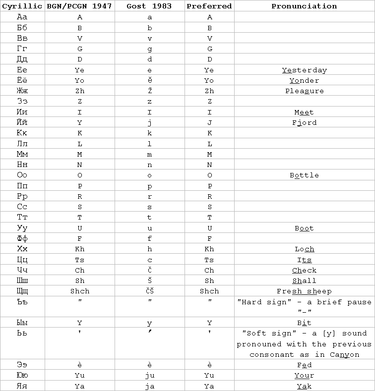 In the table below is represented the Russian Cyrillic alphabet, with 3 alternative English equvalents. The first is the BGN/PCGN standard of 1947, used for Geographic purposes. The second is the Gost standard of 1983. I personally find the Gost the most usable - but it uses characters that are more than a litle tricky to find on the keyboard. As a result, I have switched to using the third one listed - which is basically the BGN/PCGN 1947, with the exception that one of the two "Y"s in that standard is replaced with a "J".