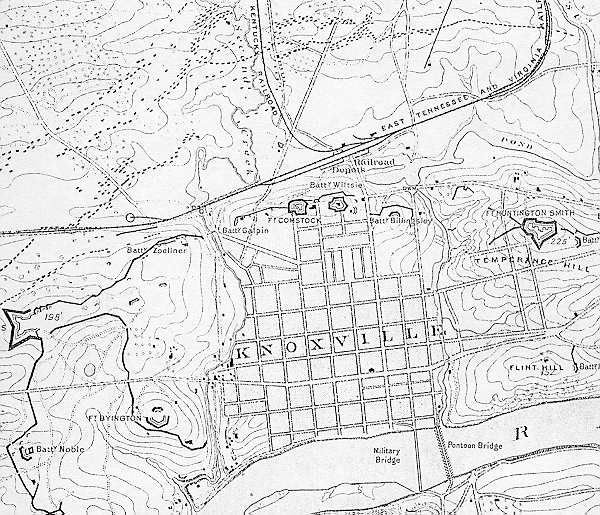 Knoxville, as the major city of East Tennessee, was served by three railroads: the East Tennessee & Georgia (from Chattanooga), the East Tennessee & Virginia (to Bristol), and the shortline Knoxville & Kentucky (to Clinton--this modest railroad was also known as the East Tennessee & Kentucky). As shown in the above map extracted from the Official Records Atlas, the three railroads converged on a common area just to the north of the city, and included a complex of sidings as well as a turntable.