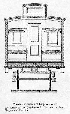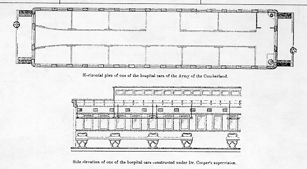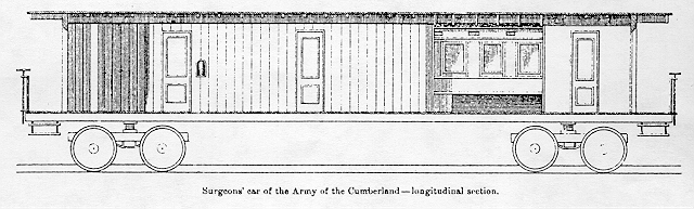 The above sketches from the Official Records Atlas illustrate the interior configurations of hospital cars as used by the Army of the Cumberland. These hospital cars resembled passenger cars (some were in fact converted passenger rolling stock) but with stacked stretchers instead of bench seats to accommodate the wounded.
