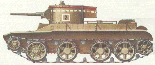 In 1932 the design team at Kharkov and KhPZ in Leningrad were instructed to adapt the new 45mm Model 1932 L/46 tank gun for their tanks. As a result of this the KhPZ developed the BT-5 Model 1933. The new BT-5 had a larger turret with a new gun, and simpler convex style wheels were used. The BT-5 Model 1933 were shortlived, because the OKMO team had developed a better turret for the 45mm gun. The first turret developed by KhPZ had only a single roof hatch and inadequate stowage. The new turret had twin hatches and this became the standard production turret until the introduction of the BT-7 in 1937. Several variants of the BT-5 were built. The BT-5PKh was fitted with a snorkel and rubber sealing to enable it to drive across rivers under water. They were first employed in the Byelorussian MD manoeuvres near Slutsk by the 4th Mechanized Regiment of the 4th Don Cossack Division headed by then unknown Georgi Zhukov. 50 BT-5 were sent to Spain to fight in the Civil War. By the experience from the battlefield both in Spain and against Japan in the Khalkin Gol battles, a new BT-7 was built.