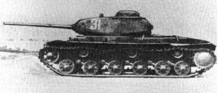 During mid 1943 the KV-tank was refitted with a cast turret having improved ballistic shape, and mounted the new 85L/53 gun. A KV-85G prototype was built, armed with the 85mm S-18 gun. The modified hull of the KV-Is mounted a new turret with thicker armour. Various technological improvements enabled the crew of this machine and all other heavy tanks to be reduced to 4 men (Commander, Gunner, Driver and Loader). Basically the KV-85 was a rearmed and re-turreted tank, designed to take the M-1943 tank version (D-5T) of the M-1939 85mm Anti-Aircraft gun. It could carry an ammoload of 70 shells. The turret was fitted with a commanders cupola, bringing the overall height of the tank up to over 9 feet. The turret had a curved mantlet and the armour on the hull was slightly reduced to 60-65mm to counterbalance the increased turret weight. The new turret design was later to be adopted by some T-34/85 - although in this case the rear machinegun was removed. The KV-IC was also retrofitted with the new turret and the both models of the KV-85 entered service in time to counter the German PzKpfw. VI Tiger and PzKpfw. V Panther. Only 130 KV-85 were manufactured from autumn 1943 - winter 1943. The KV-85s were quickly used up in the russian winter campaigns of 1943/1944.
