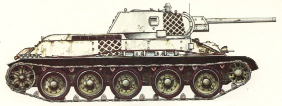 A late production T-34/76 Model 1941 with the common winter camoflauge washed over the original paint. The black stripe pattern was to break up the silouette of the tank. Especially used in winter of 1941/42.