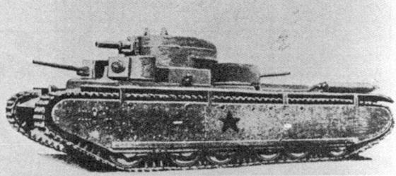 The first heavy tank adopted by the Red Army was the T-32 (also referred to as M-II), and appeard in 1930-31. This tank was based on the TG3/T-29 (Tank Grotte). This multi-turreted idea had arisen in England, but were also tested by the germans in prototype form as "Grosstractors". The idea of multi-turreted heavy tanks was supposed to enable units to operate independently, and have a chance to engage more than one enemy at the same time. With the great firepower and the thick armourplates made it possible for the T-32 to attack heavily defended areas with pillboxes, with help from the infantry, attacking behind the vehicle. The T-32 was based on the brittish A-1 "Independent" design and had 5 turrets; Mainturret mounting a 76.2mm gun, two smaller sub-turrets mounting 37mm antitank-guns, and two additional turrets with machineguns. The 76.2mm gun was mounted centrally, with the 37mm turrets placed diagonally to the front and rear on the left-hand side. The interior arrangement was identical to that in the T-28. The chassis was of riveted and welded construction and the tank was hermetically sealed against gasattacks. The hydrualic transmission was not very satisfactory. The suspension consisted of six large road wheels, combined in bogie units of two each, they were sprung by a scissors system using compression springs.