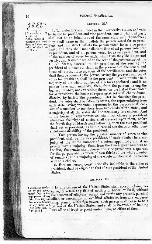 Then, I went to the "Laws of the United States of America, from the 4th of March, 1789 to the 4th of March, 1815 ..." as published by Bioren and Duane of Philadelphia. In Volume One, on page 74, the Title of Nobility Amendment is given as Article 13. The wording is exact and correct, and Yale University has an edition in their Law Library and one in the Rare Book Library. The funding for this edition of our laws was approved on February 16, 1815. The Bioren and Duane was authorized by an Act of Congress. That means that -- as of the conclusion of Congressional business on March 4th, 1815, the Thirteenth Amendment was considered valid and ratified -- and the premiere printers of Philadelphia were retained to print a summary of all U.S. laws and the Constitution.