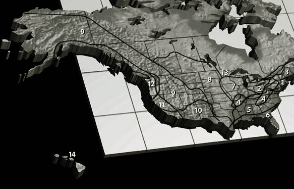 8 ~ Great Plains and Prairies 9 ~ Empty Interior 10 ~ Southwest Border Area 11 ~ California 12 ~ North Pacific Coast 13 ~ Northlands 14 ~ Hawaii |