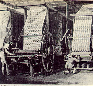 | Calico printing in a northern mill. Textile machinery made America independent of foreign imports. By 1840, there were 1,200 cotton factories in the United States |