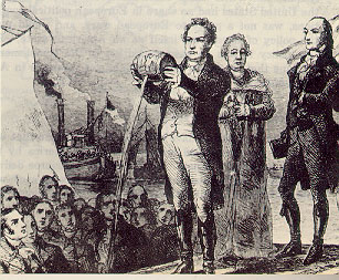 | De Witt Clinton, New York state governor, pours a kegful of Lake Erie Water into the Atlantic Ocean to celebrate the completion of the 363-mile Erie Canal |