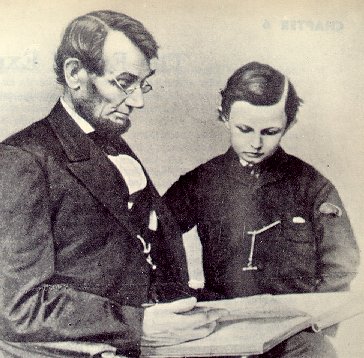 | The warmth and humanity of Abraham Lincoln's personality, together with his rare ability of statesmanship, have been the subject of innumerable literary works - stories, plays, biographies. In the picture (above) he is shown wiht his son, Tad. |