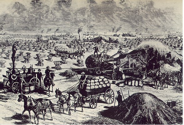 | Before 1890, farmers had adopted steam engine for use in threshing grain. Mechanization speeded development of enormous tracts of previously unproductive prairie such as the Dakota territory shown here. |