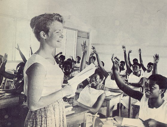 | An american Peace Corps teacher gains an eager response from her students in a classroom in Ghana |
