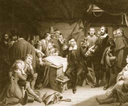 Pilgrims signing the Mayflower Compact aboard ship, 1620.
